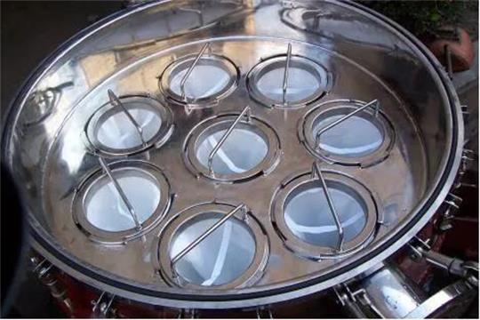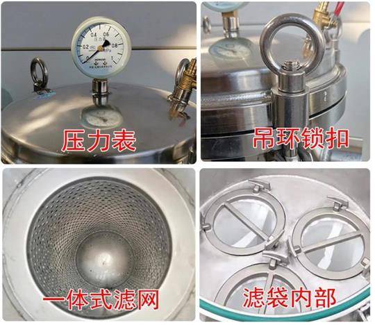 袋式過濾器是一種壓力式過濾裝置,主要由過濾筒體、過濾筒蓋和快開機(jī)構(gòu)、不銹鋼濾袋加強(qiáng)網(wǎng)等主要部件組成,濾液由過濾器外殼的旁側(cè)入口管流入濾袋,濾袋本身是裝置在加強(qiáng)網(wǎng)籃內(nèi),液體滲透過所需要細(xì)度等級(jí)的濾袋即可獲得合格的濾液。